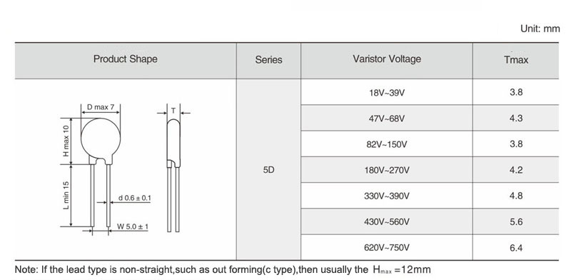 Part No. | Varistor Voltage | Maximum Allowable Voltage | Maximum Clamping Voltage | Withstanding Surge Current | Rated Wattage | Energy | Typical Capacitance | Datasheet Download | ||