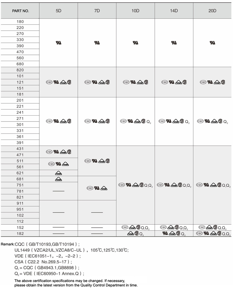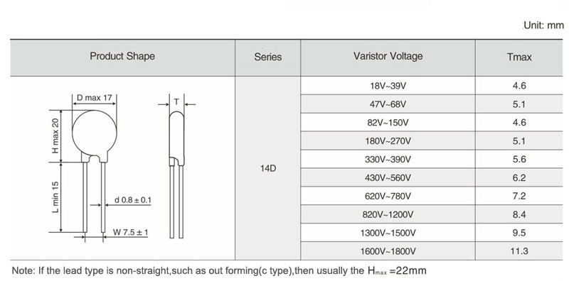 Part No. | Varistor Voltage | Maximum Allowable Voltage | Maximum Clamping Voltage | Withstanding Surge Current | Rated Wattage | Energy | Typical Capacitance | Datasheet Download | ||